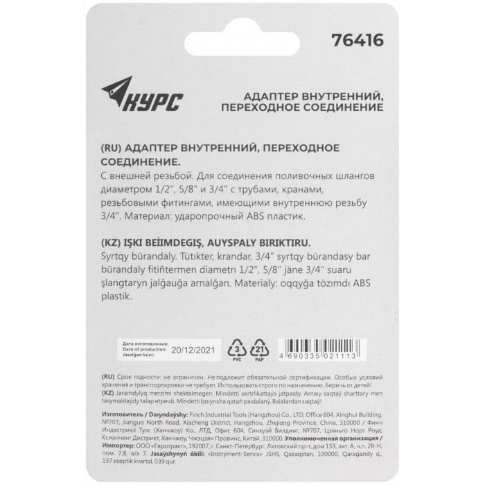 С внешней резьбой. Для соединения поливочных шлангов диаметром 1/2 и 3/4 с трубами, кранами, ресьбовыми фитингами, имеющими внутреннюю резьбу 3/4. Материал: ABS пластик. Упаковка: блистер.