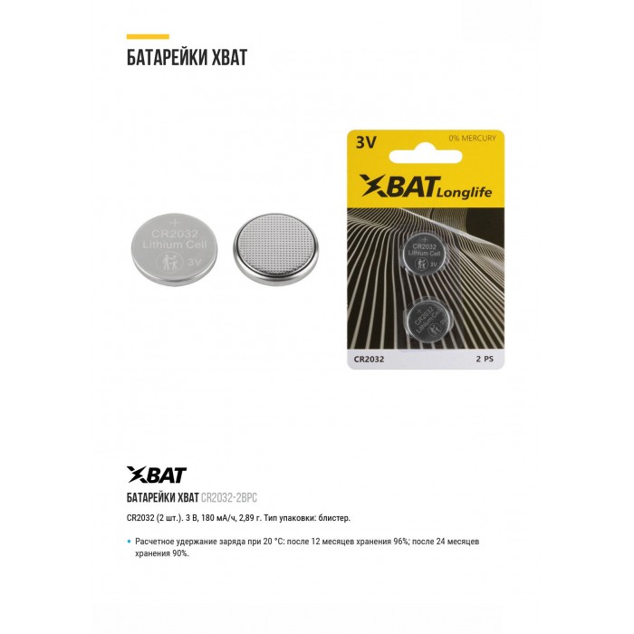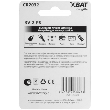 Батарейка литиевая, 3 В, "Таблетка" , 2 шт. (CR2032-2BPC)