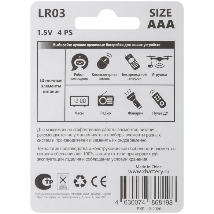 Батарейка щелочная, 1.5 В, тип АAА, 4 шт. (LR03-4BPC)