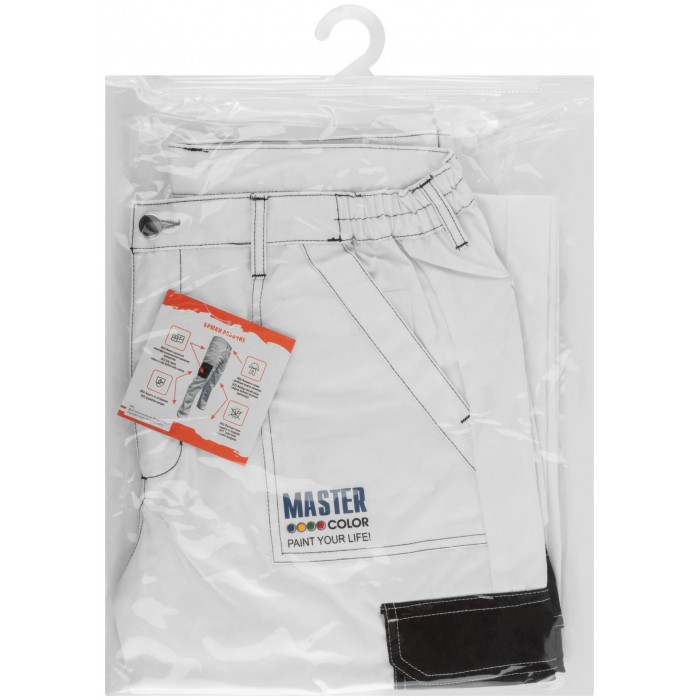 Брюки рабочие Master Color белого цвета сшиты из высококачественного материала, усиленного в местах, подверженных быстрому износу. Имеют: эластичный пояс для удобного подгона размера, 6 многофункциональных карманов, в т.ч. из ткани Оксфорд 300D. Защита от разрыва и истирания. Гарантией качества является наличие европейского сертификата, а также соответствие изделия требованиям стандарта EN ISO 13688:2013. Состав материала: полиэстер 65%, хлопок 35%.