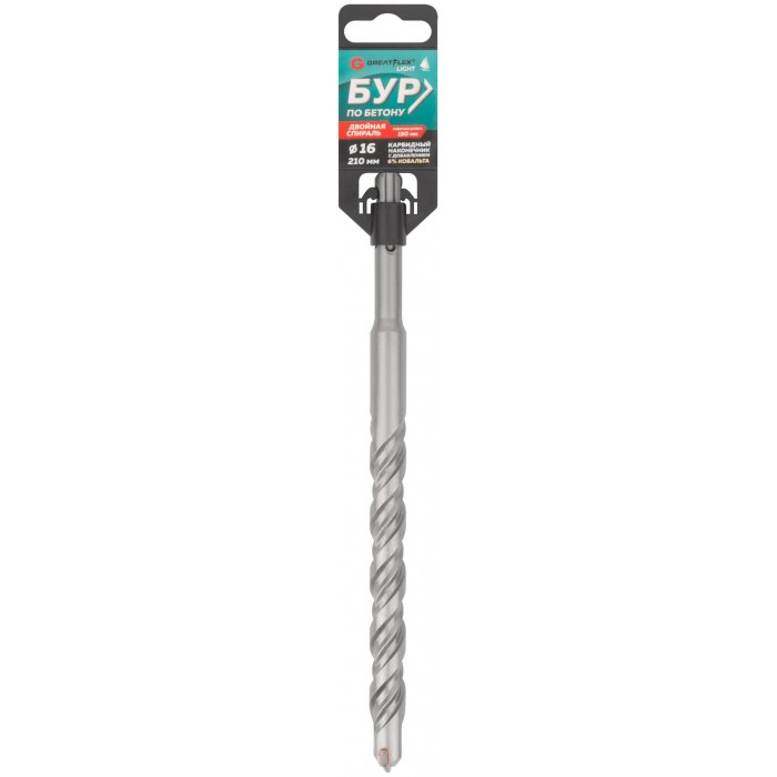 Бур по бетону GreatFlex Light для профессионального использования. Карбидный наконечник повышенной плотности с добавлением кобальта 6% гарантирует длительную работу бура без изменения диаметра. Двойная спираль сохраняет постоянную скорость бурения. Легированная инструментальная сталь с добавлением хрома увеличивает износостойкость бура к истиранию. Подходит для бурения бетона, камня, гранита и кирпича. Материал: легированная инструментальная сталь, карбидная вставка. Хвостовик SDS-Plus. Упаковка: пластиковый подвес.