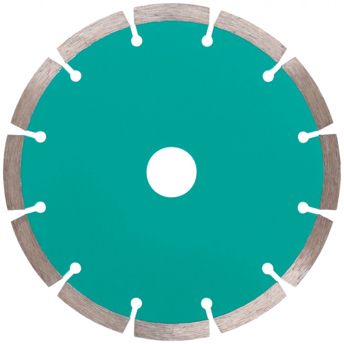 Отрезной. Сегментный. Универсальный диск, для сухой и влажной резки бетона, кирпича, гранита и камня. Посадочный диаметр 22,2 мм. Высота алмазных сегментов 7 мм. Материал: инструментальная сталь, порошок из тех. алмазов. Упаковка: картонный конверт.
