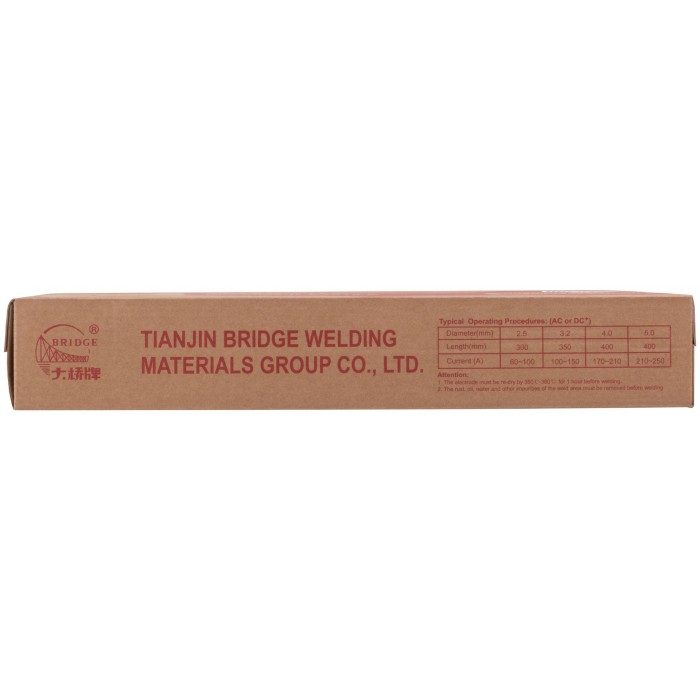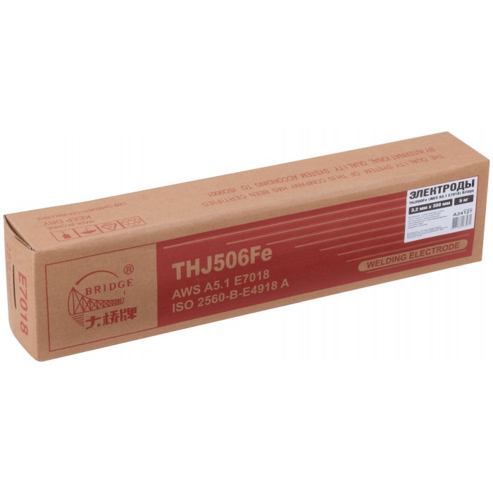 BRIDGE THJ506Fe - сварочный электрод имеет покрытие основного типа, с низким содержанием водорода. Подходит как для переменного тока, так и для постоянного. Предназначен для сварки углеродистой стали и низколегированной стали, такой как Gr 50, с классом прочности Q355. Имеет классификации: GB/T 5117 E5018, AWS A5.1 E7018, ISO 2560-B-E4918 A. Сварка позиций: PA, PB, РС, PD, PE, PF.