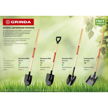 Лопата штыковая с рукояткой 380 х 208 х 1200 мм, полотно 1.6 мм, закалено, деревянный черенок высш. сорт GRINDA 421823