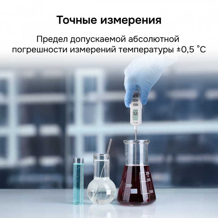 Термометр цифровой RGK CT-106, оснащенный погружным зондом длиной 128,1 мм и толщиной 3,5 мм, позволяет контролировать внутреннюю температуру целевых объектов, материалов, жидких, вязких и сыпучих веществ, выполняя измерения контактным методом в диапазоне от –40 до + 300°C. Обеспечивая высокую скорость замеров за счет быстрой реакции сенсора, и не нуждаясь в предварительных настройках, изделие характеризуется высокой оперативностью. Благодаря тому, что инструмент соответствует классу пыле-влагозащиты IP66, то допускается его использование как в помещениях, так и на улице, с мытьем под струей воды в случае загрязнения, без замачивания.