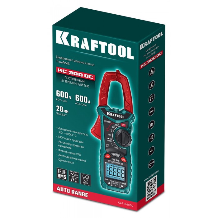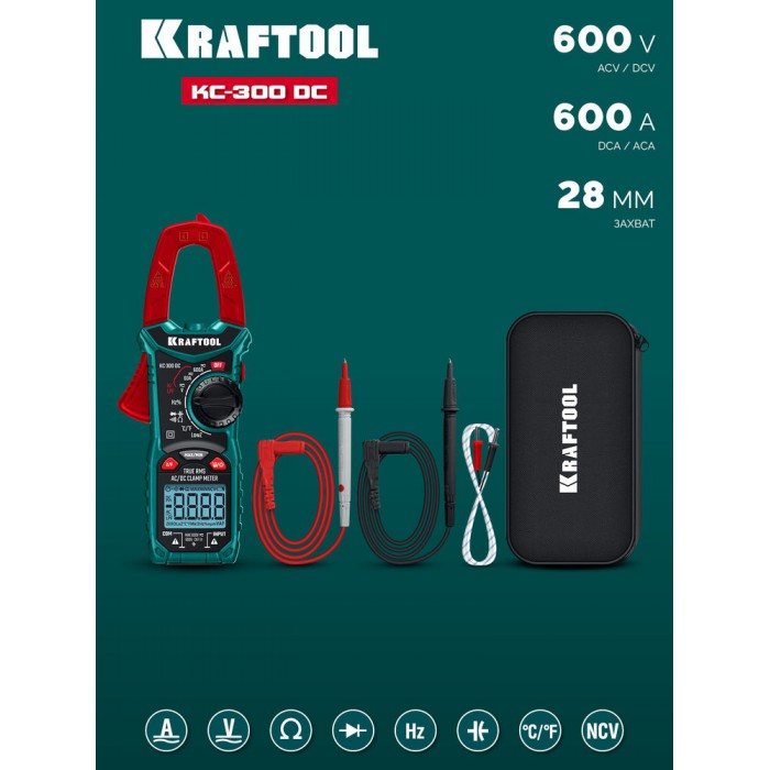 Профессиональные токоизмерительные клещи – точный прибор с полным спектром измерительных функций. Особая эргономичная конструкция и большой дисплей обеспечат удобство проведения измерений, даже одной рукой. • Высокая точность измерений • Эргономичный корпус с большим экраном • Простое и интуитивно понятное управление • Подсветка ЖК-дисплея • Автоматическое отключение питания • Компактный размер • Захват клещей 28 мм • Сохранение результата измерений (функция Hold) • Сохранение максимальных значений (MIN/MAX) • Диодный тест • Прозвонка цепей со звуком • Автоматическая индикация перегрузки • Категория безопасности по ГОСТ Р 52319 (МЭК 61010-1): КАТ III 600 B • Степень защиты по ГОСТ 14254: IP20