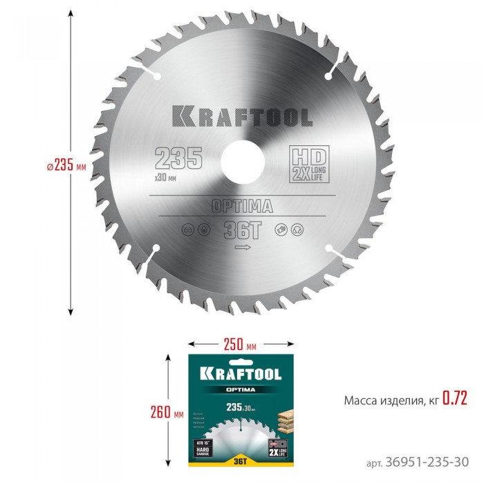 Пильный диск по дереву Optima, 235 х 30 мм, 36Т KRAFTOOL 36951-235-30