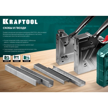 Скобы Kraftool изготовлены из закаленной проволоки с использованием новейших технологий специально для промышленного и профессионального применения.