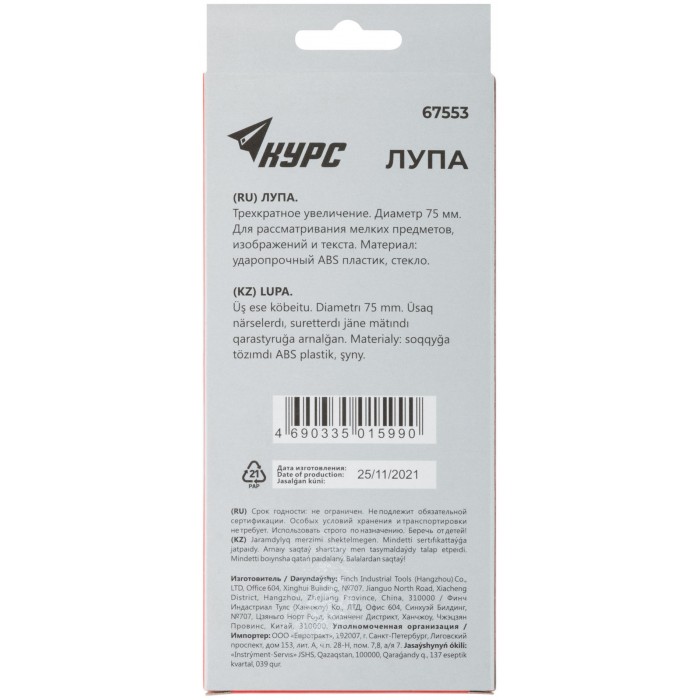 Лупа, пластиковый корпус, 75 мм-3Х (67553)