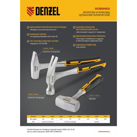 Молоток-гвоздодер 450 г, цельнометаллический, двухкомпонентная рукоятка Denzel (10423)