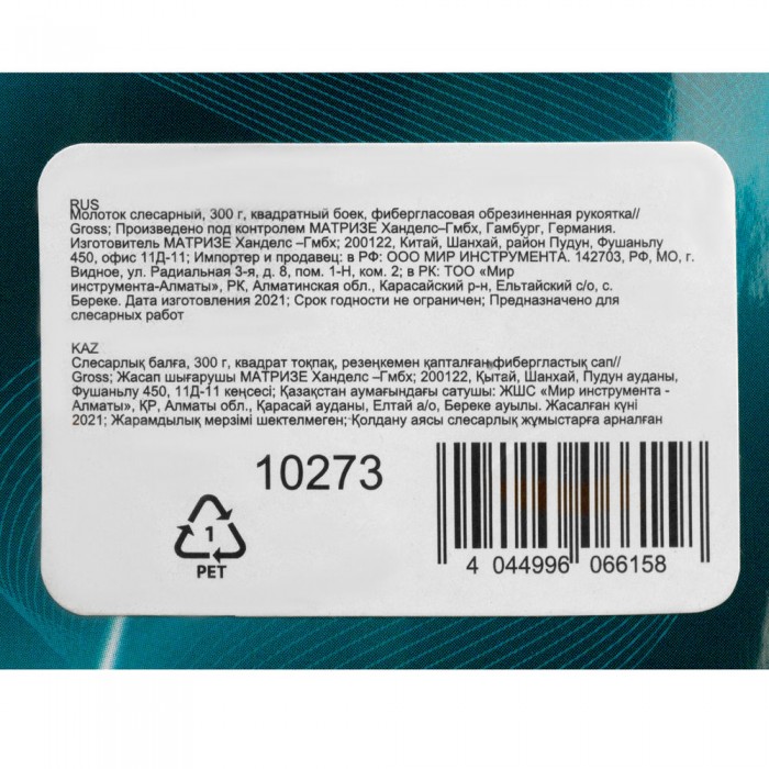 Молоток слесарный, 300 г, квадратный боек, фибергласовая обрезиненная рукоятка Gross
