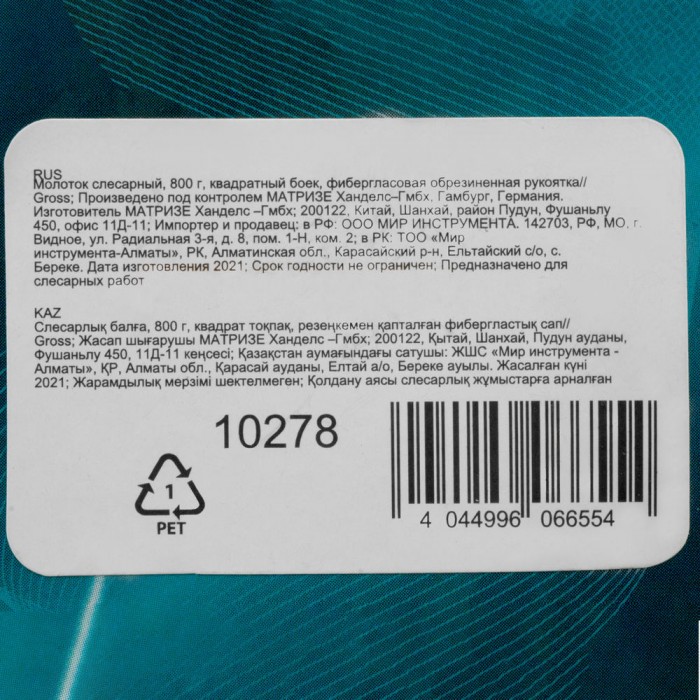 Молоток слесарный, 800 г, квадратный боек, фибергласовая обрезиненная рукоятка Gross