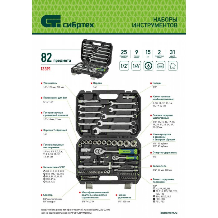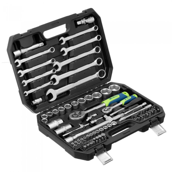 Набор инструментов, 1/2", 1/4", пластиковый кейс, 82 предмета Сибртех