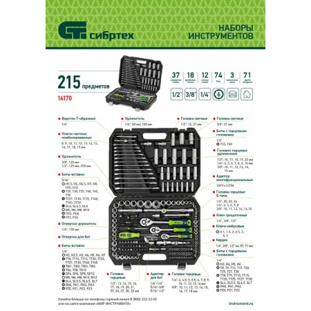 Набор инструментов, 1/2", 3/8", 1/4", пластиковый кейс 215 предм. Сибртех