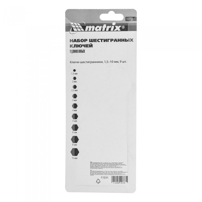 Набор ключей имбусовых HEX, 1.5-10 мм, CrV, 9 шт, удлиненные Matrix