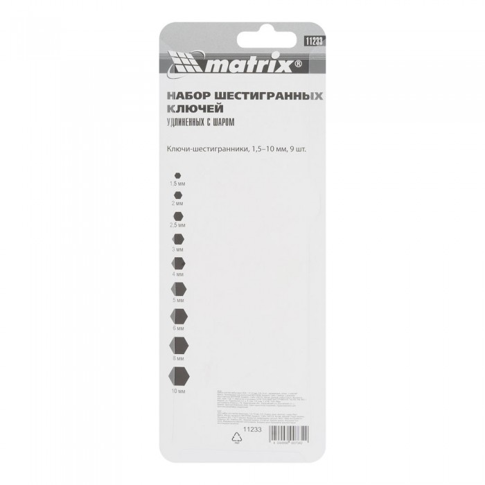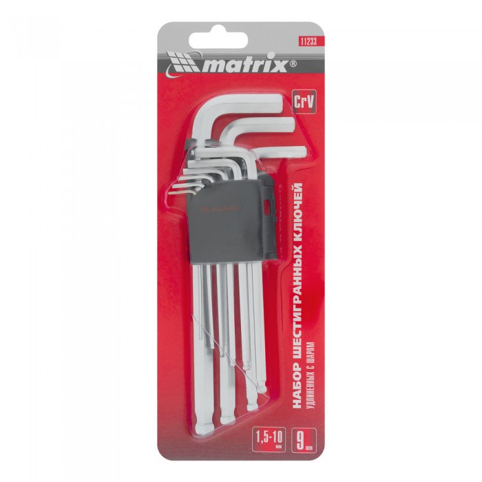 Набор ключей имбусовых HEX, 1.5-10 мм, CrV, 9 шт, удлиненные, сатин, с шаром Matrix