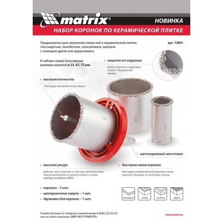 Набор коронок по керамической плитке, 33-67-73 мм, шестигранный хвостовик Matrix (72841)