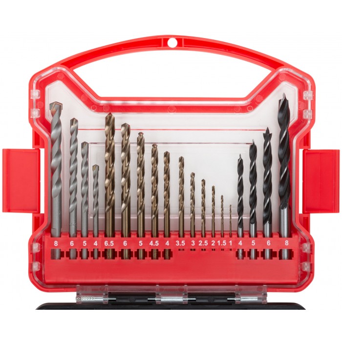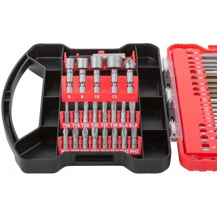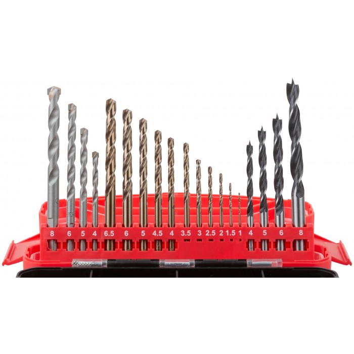Сверло HSS 11 шт: (1/1.5/2/2.5/3/3.5/4/4.5/5/6/6.5 мм). Сверло по дереву 4 шт: (4/5/6/8 мм). Сверло по бетону 4 шт: (4/5/6/8 мм). Бита 25 мм 16 шт: PH1, PH2 (2 шт), PH3, PZ1, PZ2 (2 шт), PZ3, T10, T15, T20, Т25, Т27, Т30, SL4, SL6. Торцевые биты 4 шт: (6,8,10,13) Зенковка 1 шт. Адаптер для бит, с магнитным держ-лем 1 шт.