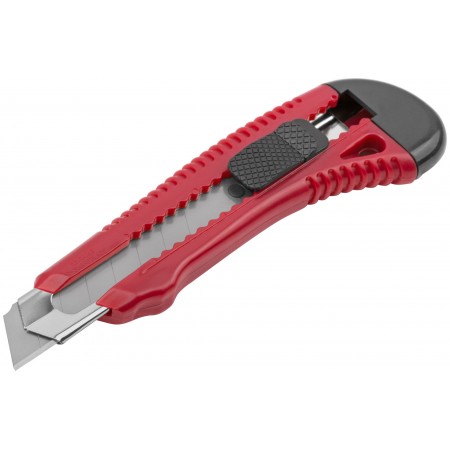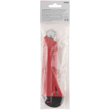 «Оптима». Сегментированное лезвие из высокоуглеродистой инструментальной стали. Пластиковый корпус, усиленный металлической направляющей. Упаковка: п/э пакет с подвесом.
