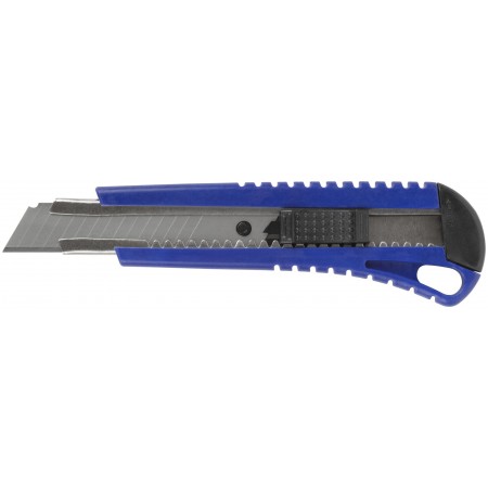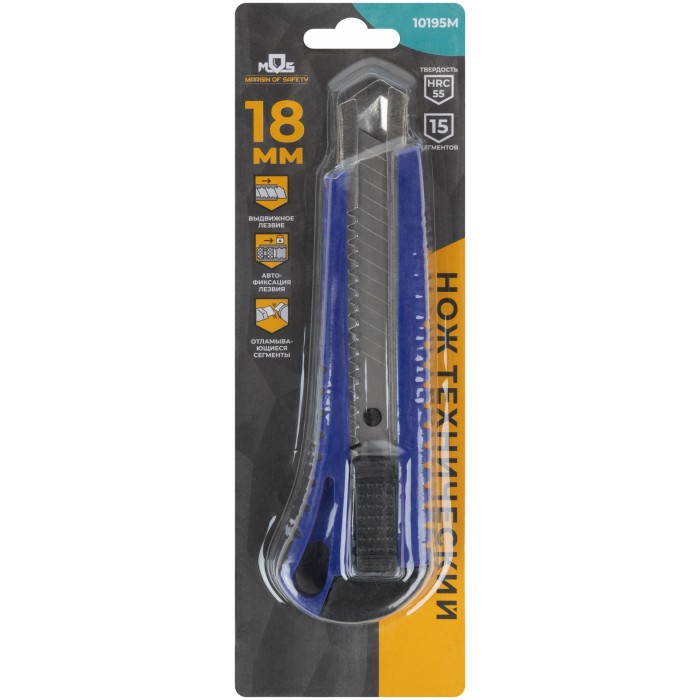 Лезвие -15 сегметов. Для резки различных материалов: Автофиксация лезвия. Материал: пластиковый корпус, усиленный металлической направляющей, лезвие из инструментальной стали. Упаковка: п/э пакет с картонным подвесом.