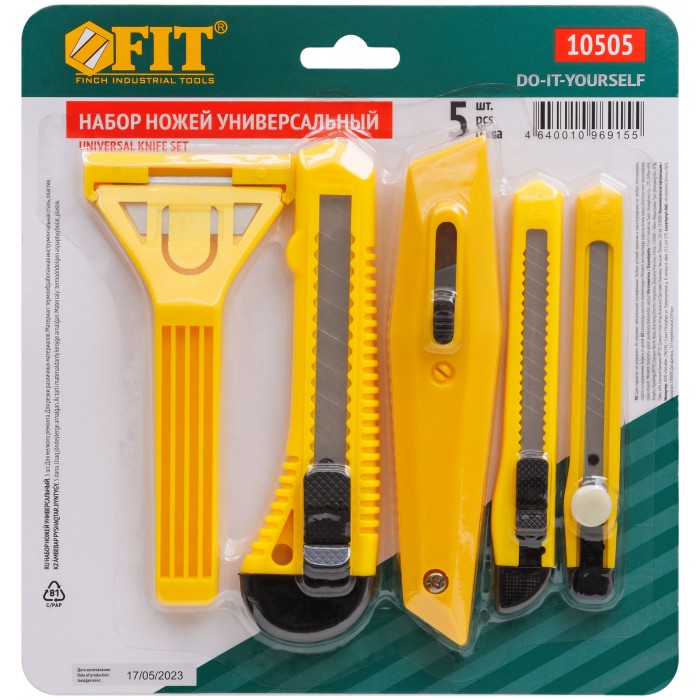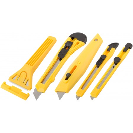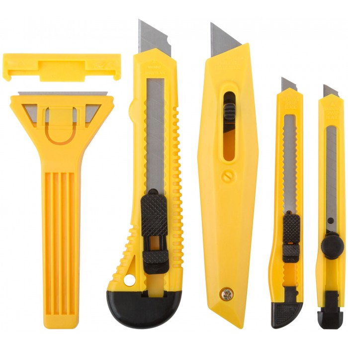 Набор многофункциональный. Для мелкого ремонта. В наборе: скребок стекольный, нож технический (b = 18 мм), нож для ленолиума с трапецивидным лезвием, пластмассовый корпус, нож технический (b = 9 мм) – 2 штуки. Материал: инструментальная сталь, пластик. Упаковка: блистер.