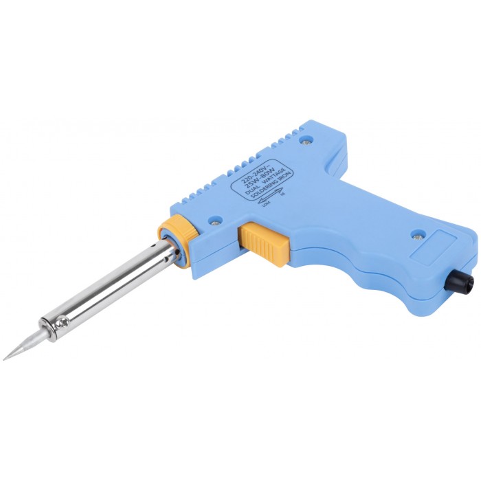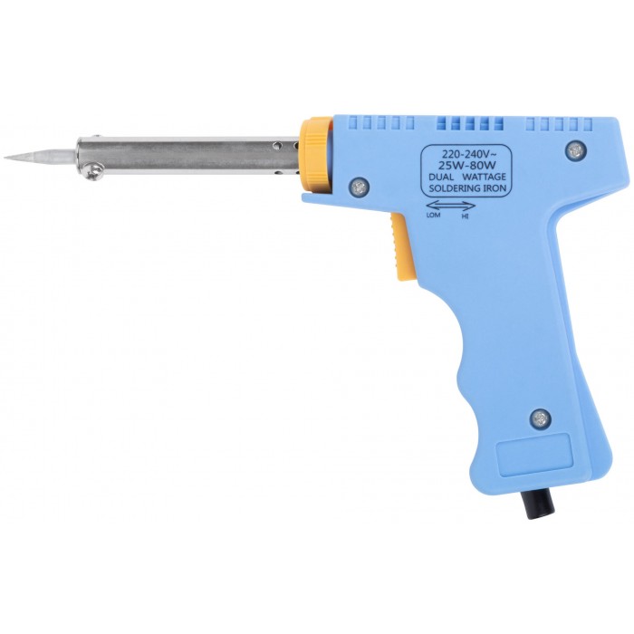 220 В, два режима работы 25/80 Вт. Сменное медное жало с долговечным защитным покрытием. Для нагрева деталей, лужения и пайки электрических схем, электротехнических изделий и компонентов при помощи легкоплавких припоев. Паяльник работает в двух режимах мощности. При отпущеной кнопке (курке) паяльник работает в режиме 25 Вт. Нажатие и удержание кнопки (курка) активирует режим 80 Вт.Материал: инструментальная сталь, пластиковый корпус. Упаковка: блистер.