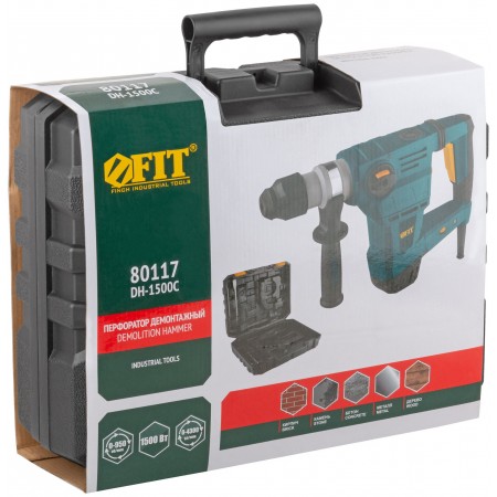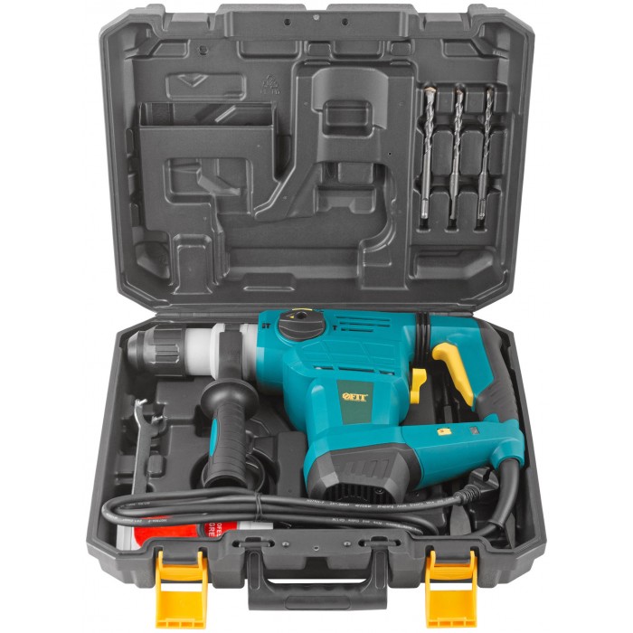 1500 Вт; 0-950 об/мин; 0-4300 уд/мин; 5 Дж; 7А; Д/Б/М - 40/32/30 мм; 5,2 кг; кейс. Три режима работы (сверление, сверление с ударом, долбление), режим поворота сменного инструмента, универсальный патрон SDS-PLUS, электропневматическая функция удара, вертикальное расположение двигателя, регулировка частоты вращения, индикатор включения в сеть, демпфер ручки, защита от заклиниваня буров, быстрый доступ к щеткам, резиновые вставки.