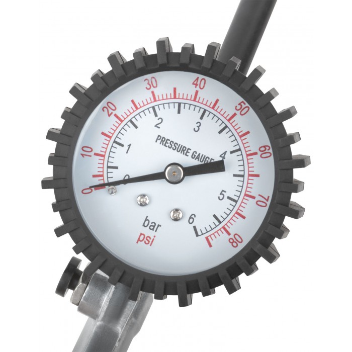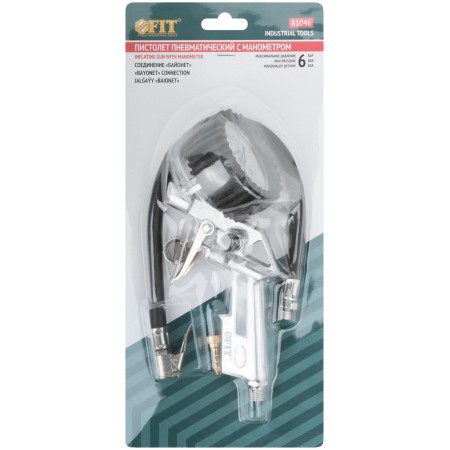 Пистолет с манометром, до 6 атм, 0,1 атм. Матери-ал: алюминий. Cоединение байонет. Измеритель-ная шкала до 6 атмосфер, с шагом 0,1 атмосферы, диаметр выходного отверстия (ниппель) 1/4”, по-перечное расположение манометра. Используется для контроля давления при подаче воздуха.