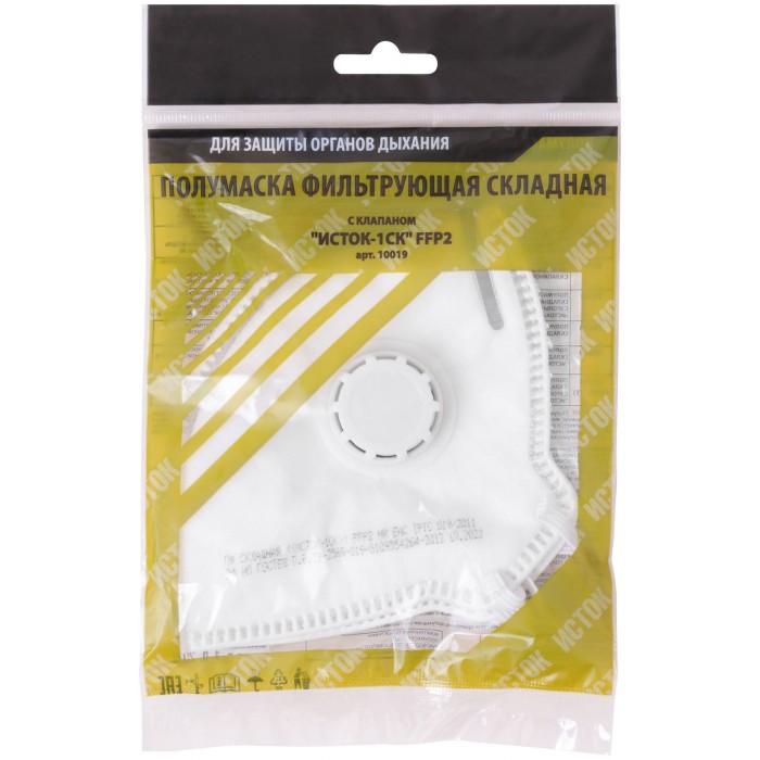 «ИСТОК-1СК». Полумаска фильтрующая,противоаэрозольная. С клапаном выдоха. Четырехслойный фильтр, носовой зажим. Обеспечивает эффективную защиту органов дыхания от всех видов аэрозолей (пыль, дым, туман). Клапан выдох препятствует накоплению под респиратором тепла и влаги, облегчает дыхание. Материал: спанбонд, мельтблаун, акваспан. Упаковка: п/э пакет.