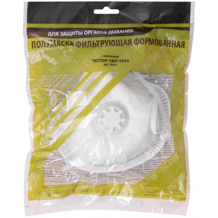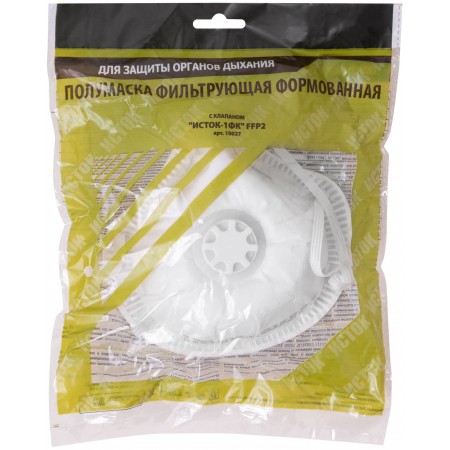 «ИСТОК-1ФК». Полумаска фильтрующая, формованая, противоаэрозольная. С клапаном выдоха. Трехслойный фильтр. Обеспечивает эффективную защиту органов дыхания от всех видов аэрозолей (пыль, дым, туман). Клапан выдоха препятствует накоплению под респиратором тепла и влаги, облегчает дыхание. Материал: полиэфирное полотно, мельтблаун, спанбонд. Упаковка: п/э пакет.