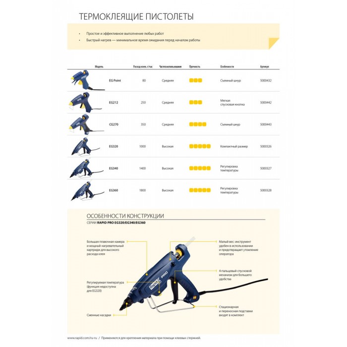 EG212 технологичный и эргономичный клеевой пистолет с отличным соотношением цены и качества идеален для быстрого и легкого выполнения работ по декорированию и ремонту по всему дому. Поставляется с регулируемой подставкой для более эффективного нанесения клея, среди других особенностей мягкий курок для лучшего контроля и удобства, а также силиконовую защиту насадки.