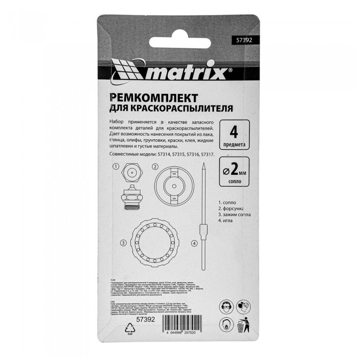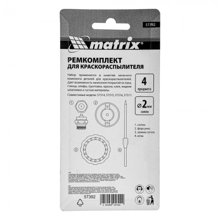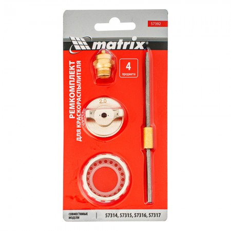 Ремкомплект для краскораспылителя 4 предмета: сопло 2,0 мм, игла, форсунка, зажим сопла Matrix (57392)