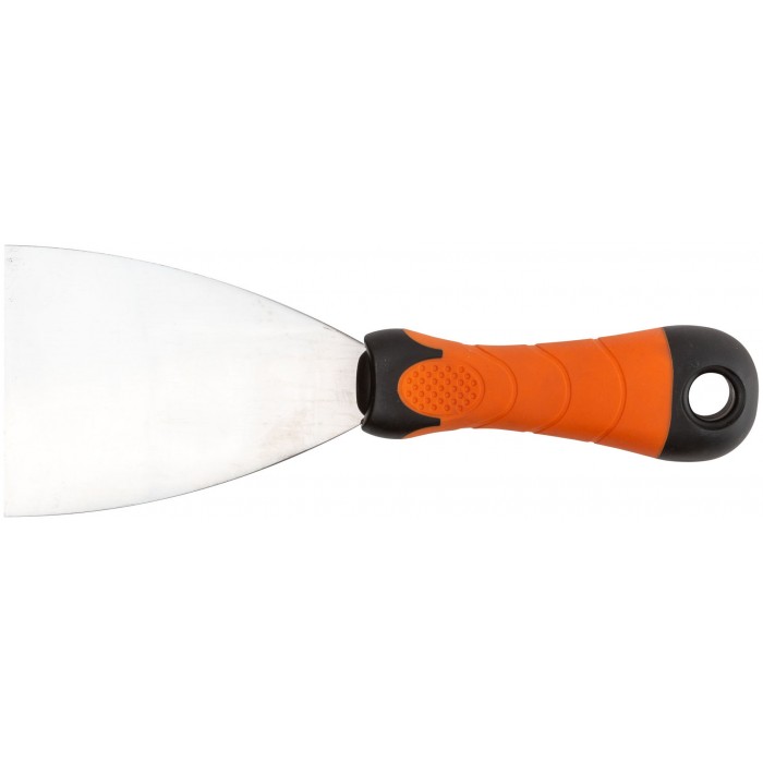 Шпатель из нержавеющей стали для штукатурных работ, эргономичная 2-К ручка. Материал: нержавеющая сталь, прорезиненная ручка.