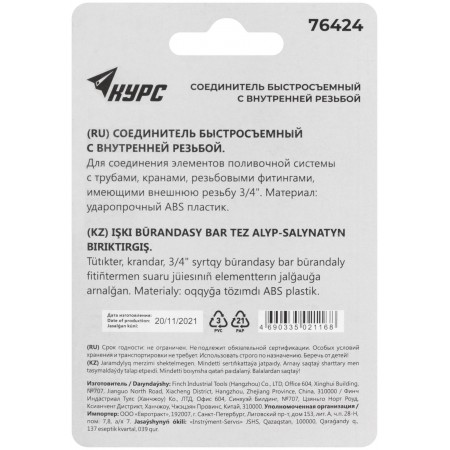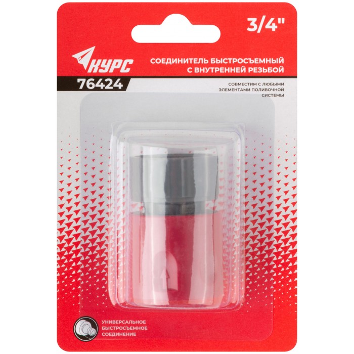 Быстросъемный с внутренней резьбой. Для соединения элнментов и насадок поливочной системы с трубами, кранами, резьбовыми фитингами, имеющими внешнюю резьбу 3/4''. Материал: ABS пластик. Упаковка: блистер.