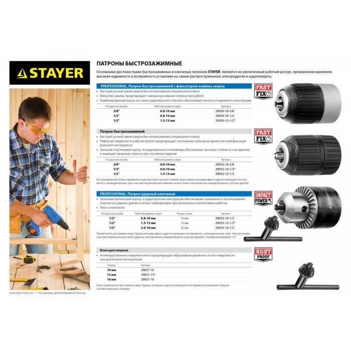 Основным достоинством быстрозажимных патронов STAYER является их увеличенный рабочий ресурс, проверенная временем высокая надёжность и возможность установки на самые распространённые на рынке электродрели и шуруповерты.