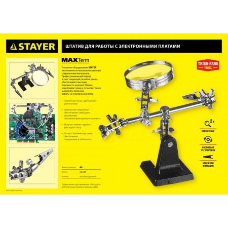 Штатив освобождает руки и позволяет легко осуществлять паяльные работы на электронной плате при помощи зажимов для крепления и поворотного механизма и качественной линзы. Необходимой при пайке элементов малого размера.