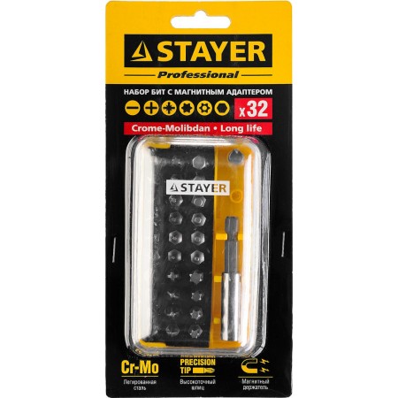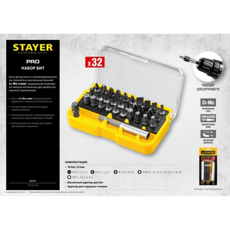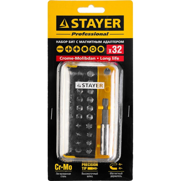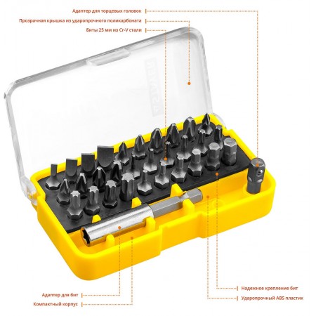 Профессиональные биты для ручного и механизированного инструмента изготовлены из высококачественной стали и имеют точную геометрию шлицов, что обеспечивает длительный срок службы. В комплект входит магнитный адаптер.