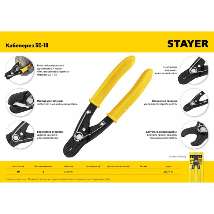Кабелерезы STAYER изготовлены из высококачественной стали и предназначены для резки небронированного одножильного и многожильного кабеля из цветных металлов ( Cu + Al ) без деформации и замятия краев.