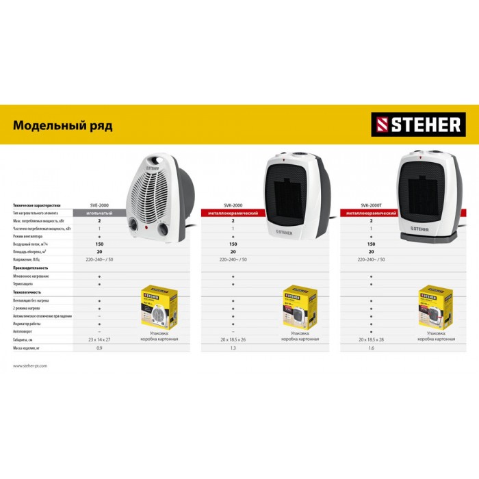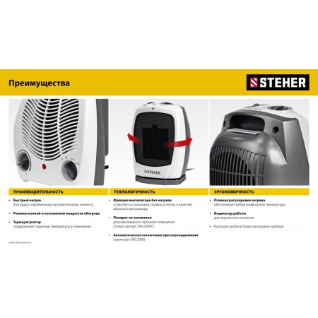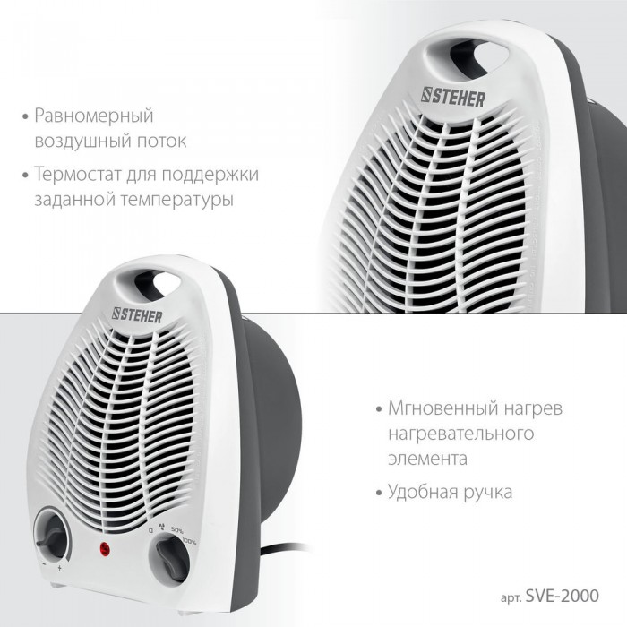 Тепловентилятор STEHER SVE оснащен высокоэффективным игольчатым нагревательным элементом 2000 Вт.Мгновенно обогревает помещение площадью до 20 м². Тепловентилятор отличается пониженным уровнем шума в процессе работы, что делает его использование максимально комфортным. Режим вентиляции без обогрева позволяет использовать прибор и летом в качестве обычного вентилятора. Возможность регулирования, как мощности, так и температуры нагрева воздуха позволяет создать наиболее комфортный микроклимат в помещении.