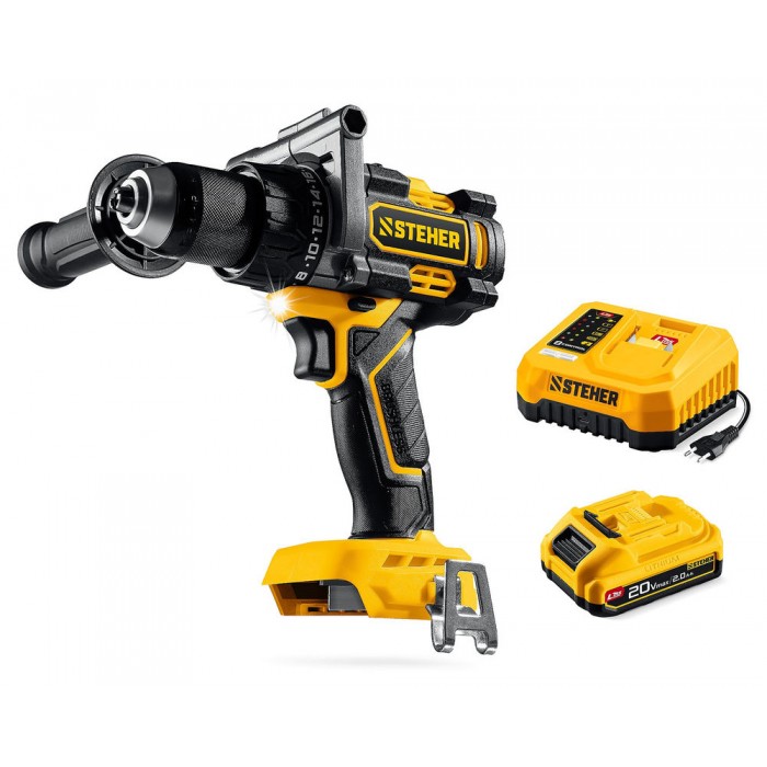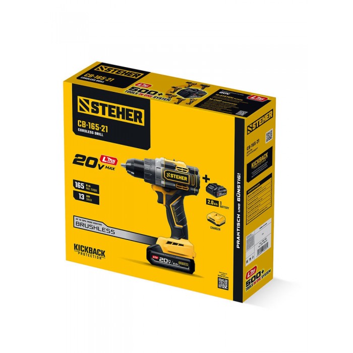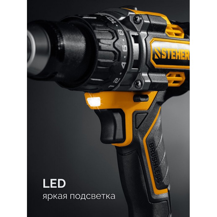 Бесщеточная дрель-шуруповерт STEHER системы LMS с максимальным крутящим моментом 165 Нм предназначена для работы с самым крупным крепежом (саморезы до 12 мм диаметром) и сверления отверстий до 40 мм в дереве. Встроенная защита от обратного удара предотвращает повреждение кисти при резкой блокировке вала. Комплектация с аккумулятором позволяет начать работу сразу после покупки