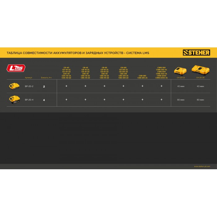 Аккумуляторная батарея для инструмента STEHER системы LMS позволит Вам работать еще дольше и производительнее. Усовершенствованная технология элементов обеспечивает повышенные удельные характеристики и длительный срок службы