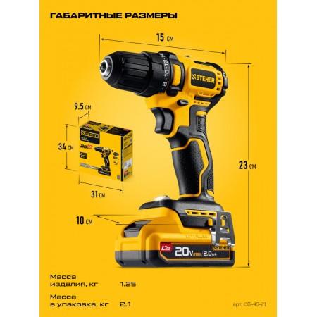 Бесщеточная дрель-шуруповерт STEHER обеспечивает как точное заворачивание маленьких саморезов, так и уверенное закручивание крупного крепежа до 8мм. Компактный размер и современный дизайн делают ее удобной для работы. Комплектация с аккумулятором позволяет начать работу сразу после покупки