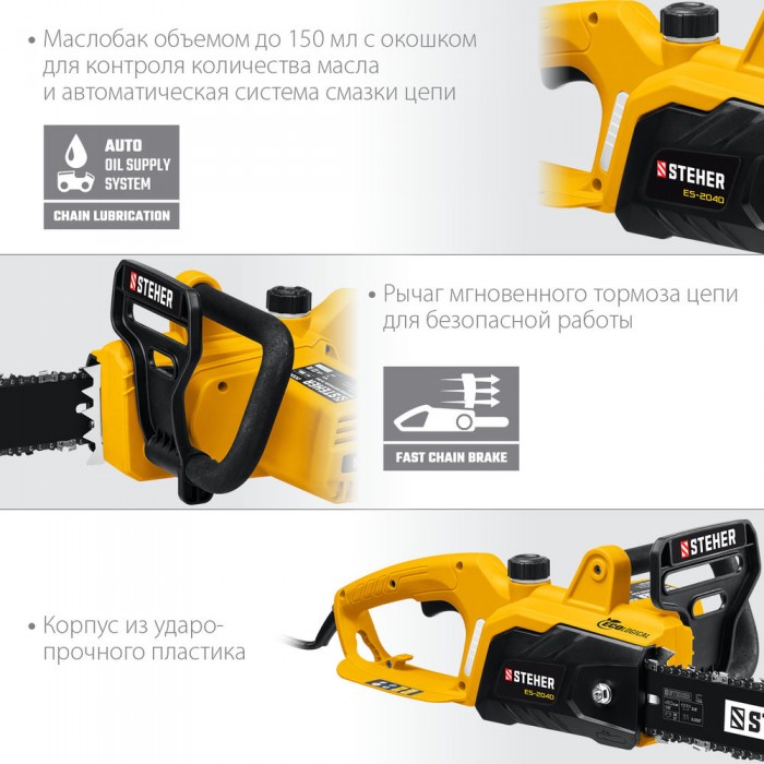 - Автоматическая система смазки цепи дозированно подает масло в зависимости от нагрузки