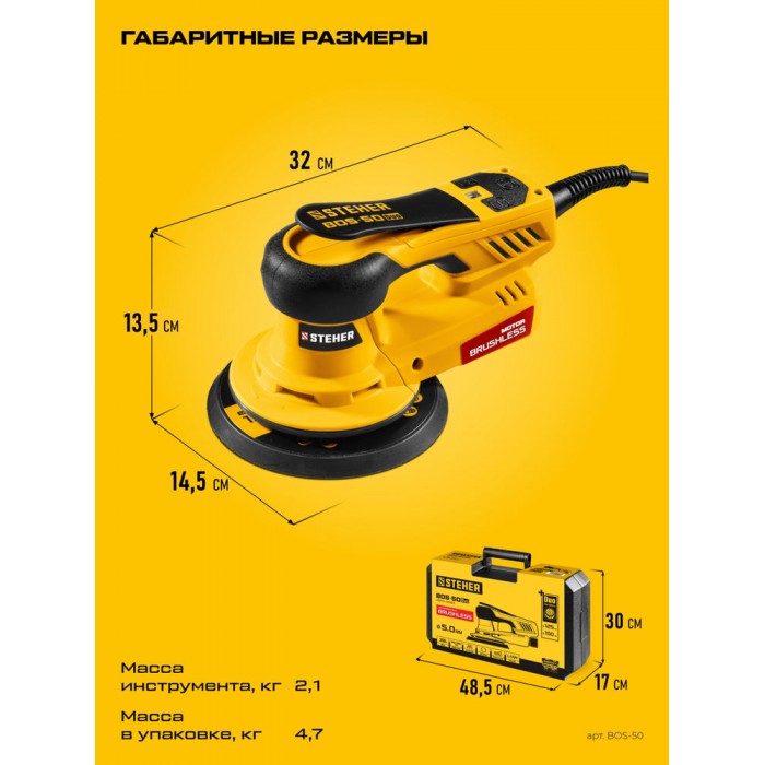- защита от перегрузки предохраняет оператора и изделие - Эксцентриковый ход с большим эксцентриситетом 5.0 мм вкупе с вращательным движением имитирует ручное шлифование и предотвращает повреждение поверхности, т.к. на каждом обороте абразив движется по новой траектории