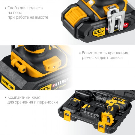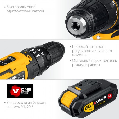Новый недорогой ударный шуруповерт Steher - помощник в сверлении и заворачивании. Индивидуальный дизайн, удобная эргономика, высокие скорость и крутящий момент обеспечивают комфортную и производительную работу. ″Мягкая″ муфта с минимальным крутящим моментом 0.2 Нм позволяет работать с компьютерными винтиками или мебельной отделкой