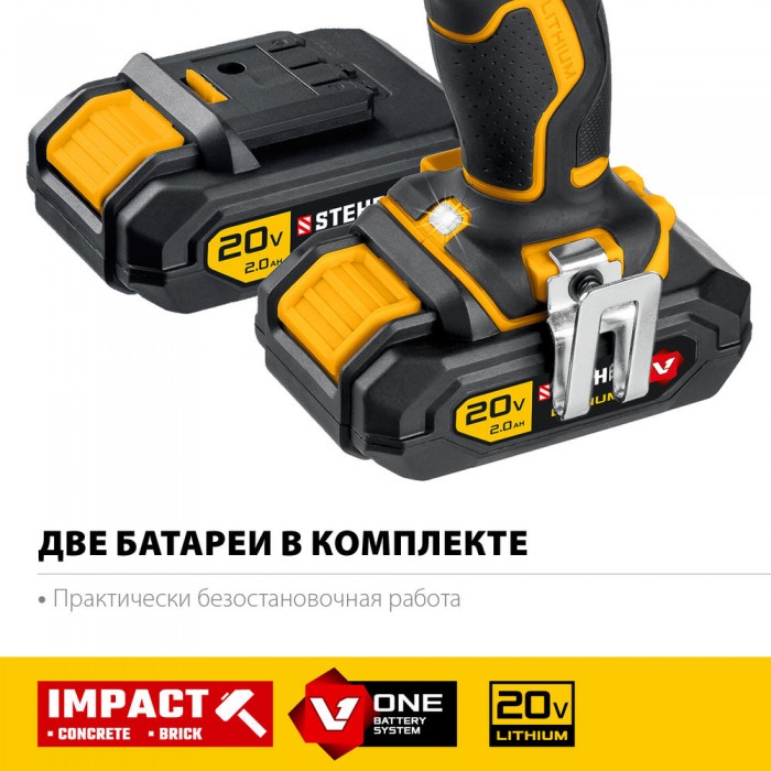 - Два аккумулятора универсальной системы Li-Ion V-ONE повышенной емкости 2.0 А*ч позволяют инструменту работать дольше и эффективнее