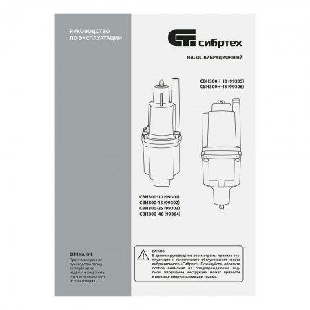 Вибрационный насос СВН300-25, верхний забор, 300 Вт, напор 75 м, 1200 л/ч, кабель 25 м Сибртех (99303)