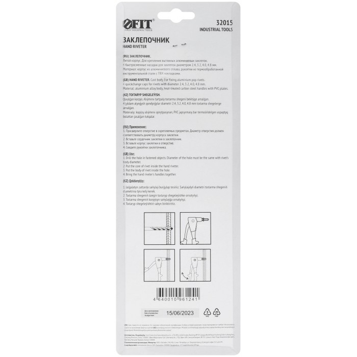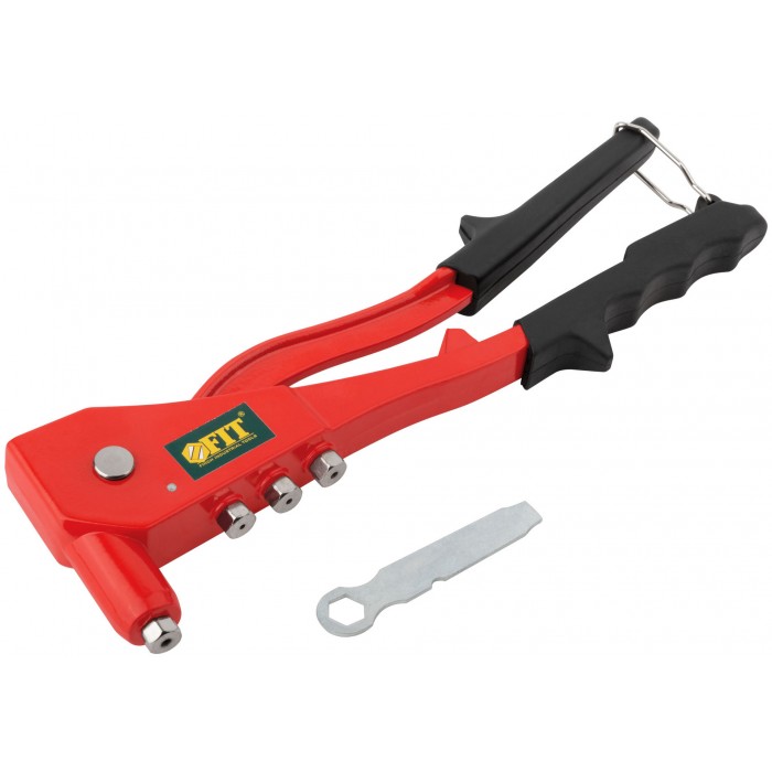 Профи. Для крепления вытяжных алюминиевых заклепок. 4 быстросменных насадки, пружинный рычаг для выброса сердечника от заклепок. Материал: литой корпус из алюминиевого сплава, рукоятка из инструментальной стали с покрытием из ПВХ пластика. Упаковка: блистер.