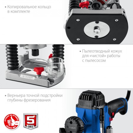 Фрезер ЗУБР серии Профессионал – многофункциональное изделие для всех видов фрезерования (продольного, фигурного, по шаблону, по радиусу) различных материалов. Мощный двигатель и максимальная глубина погружения 50 мм обеспечивают эффективную и производительную работу. Удобная эргономика и бОльшая маневренность благодаря удлиненной основной рукоятке способствуют удобству при работе