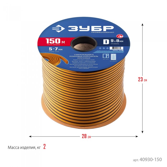 Уплотнитель резиновый самоклеящийся D-профиль 150 м размер 9?8 мм коричневый ЗУБР Профессионал 40930-150_z01